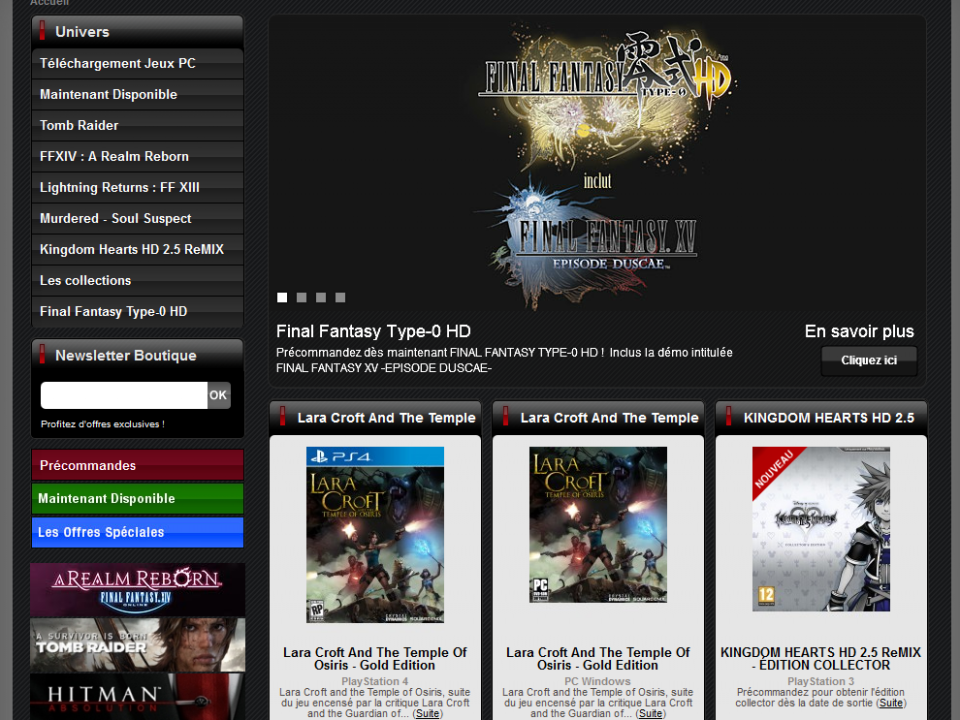 13 novembre 2014Optimisations MAGENTODifférents travaux d’optimisations sur la boutique (magento) du célèbre jeu vidéo Final Fantasy! http://www.square-enix-boutique.com